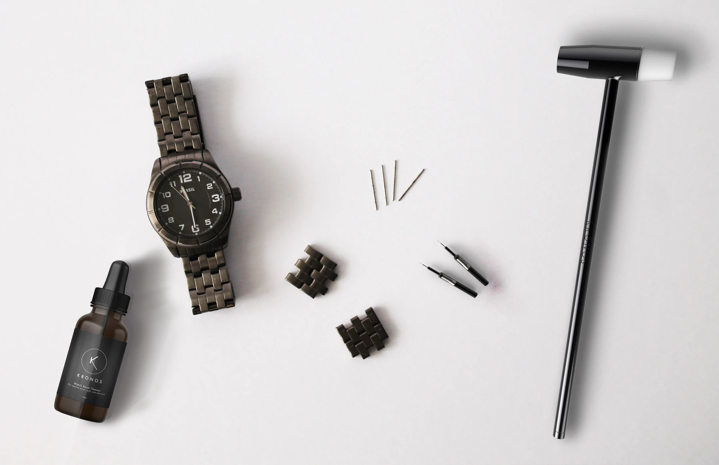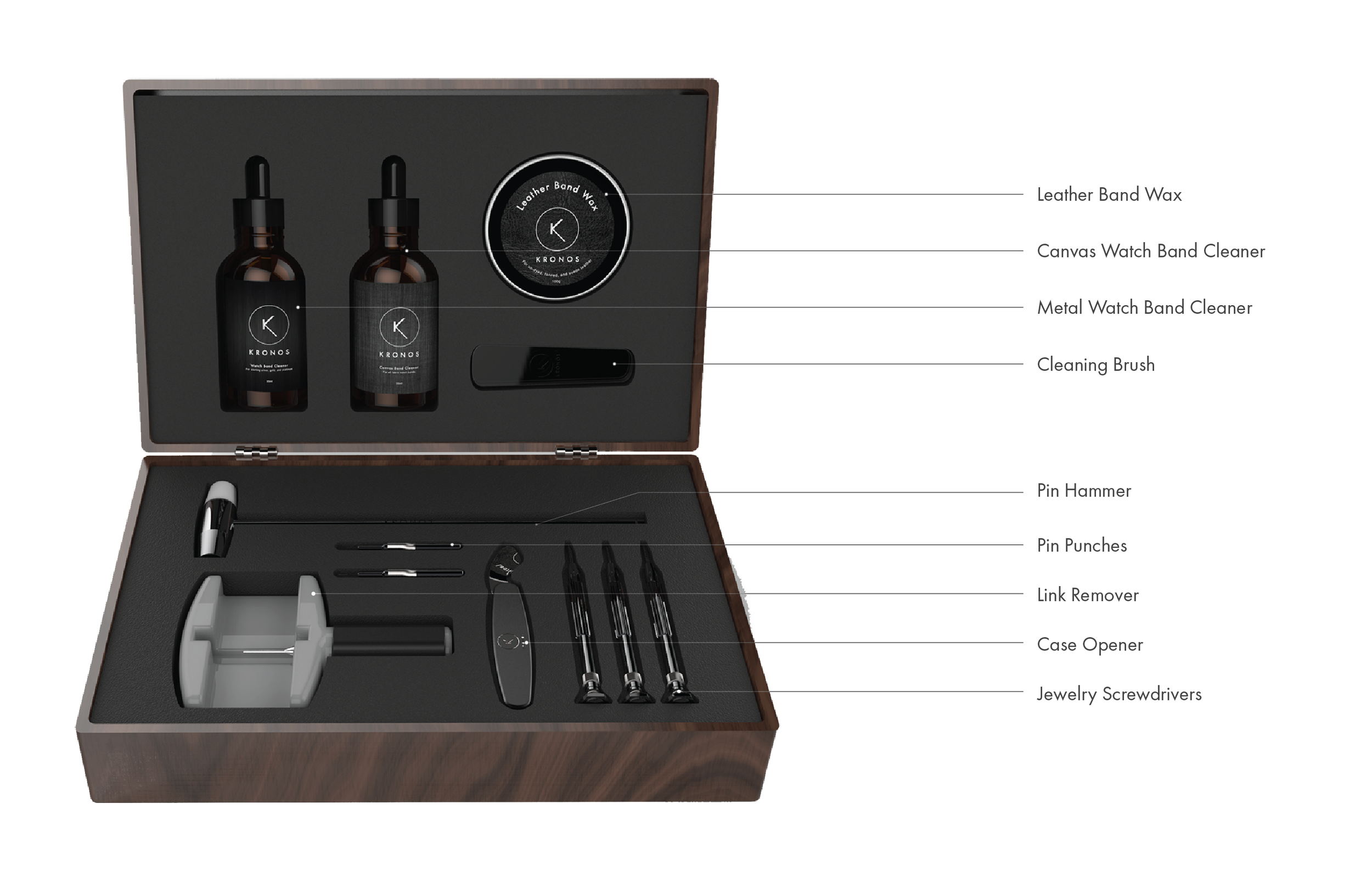 Encased in a Mahogany box, here are tools and cleaners for watch lovers to make time last forever.