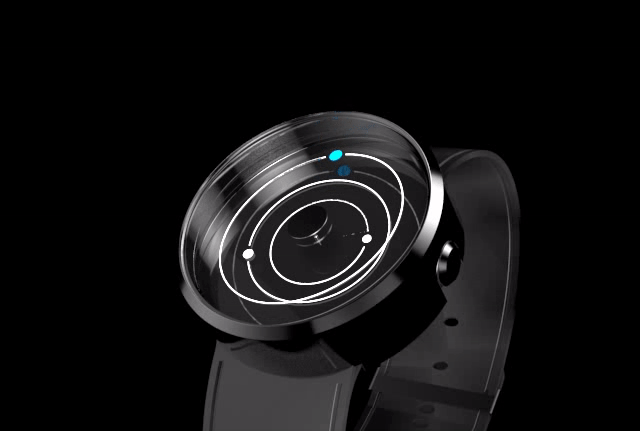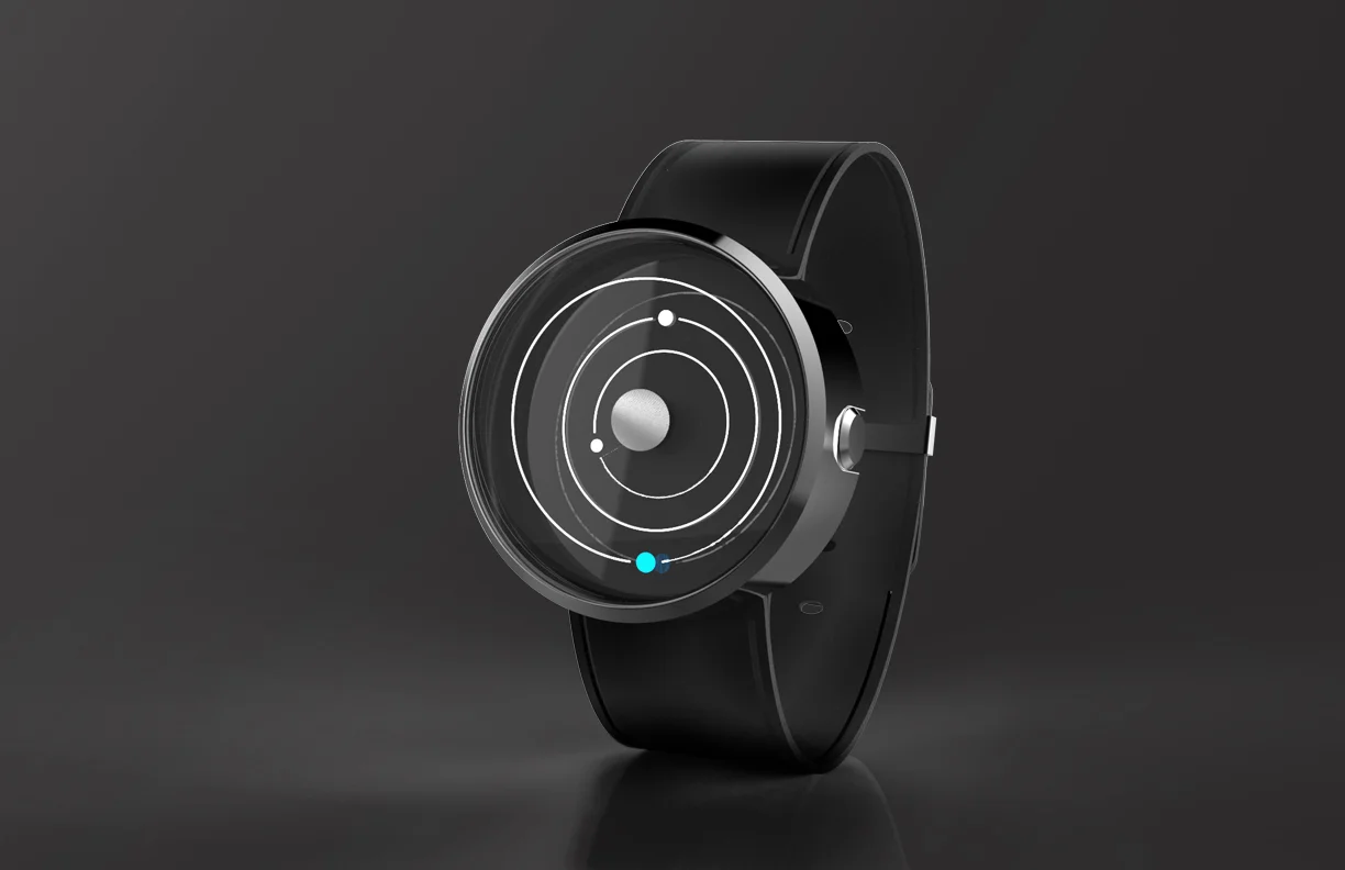 The sleek black anodized aluminum casing is complimented by a smooth leather band - both mimicking the darkness of space.